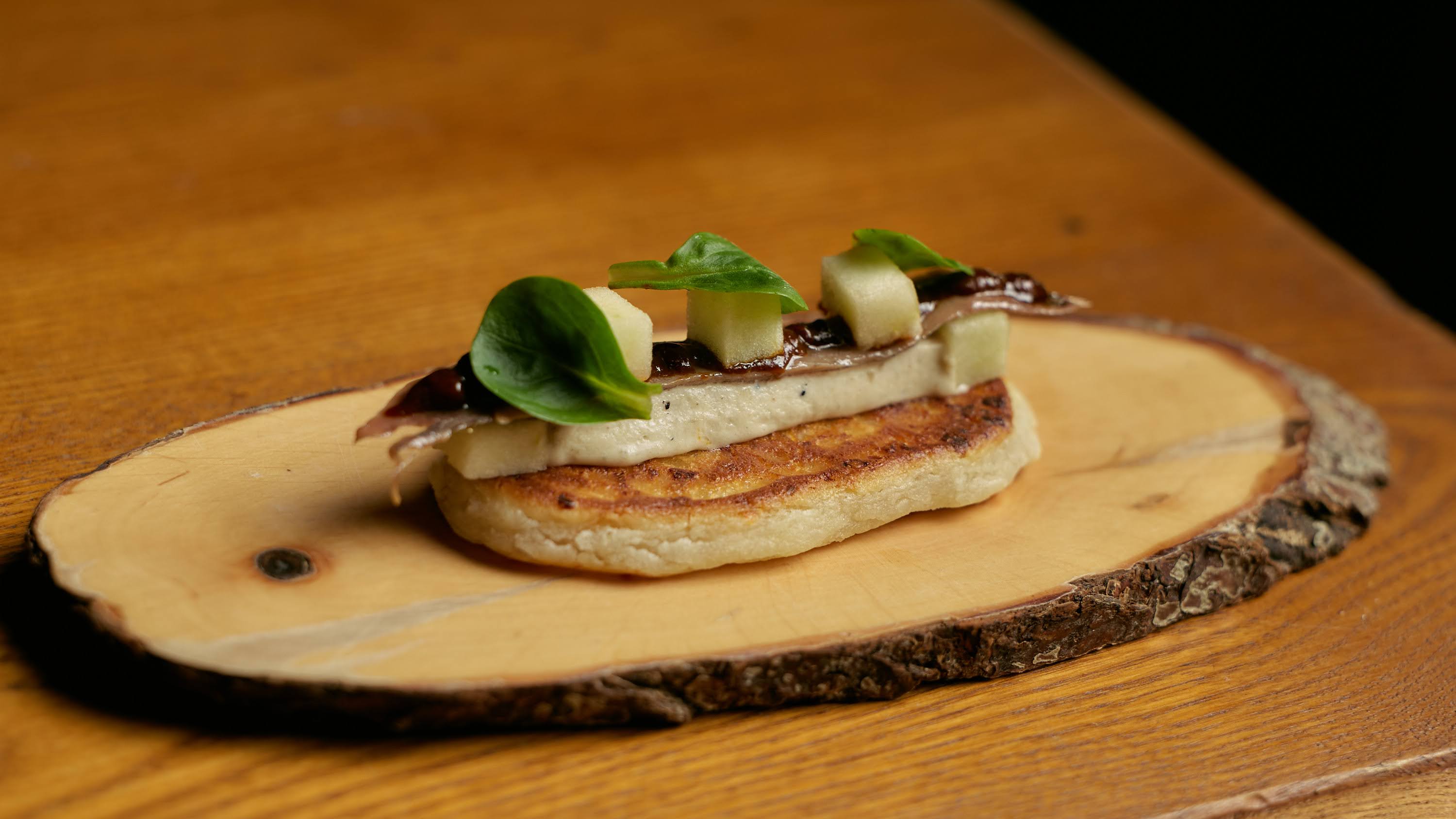 Tosta de maíz fermentado con ventresca de atún ahumada al momento.