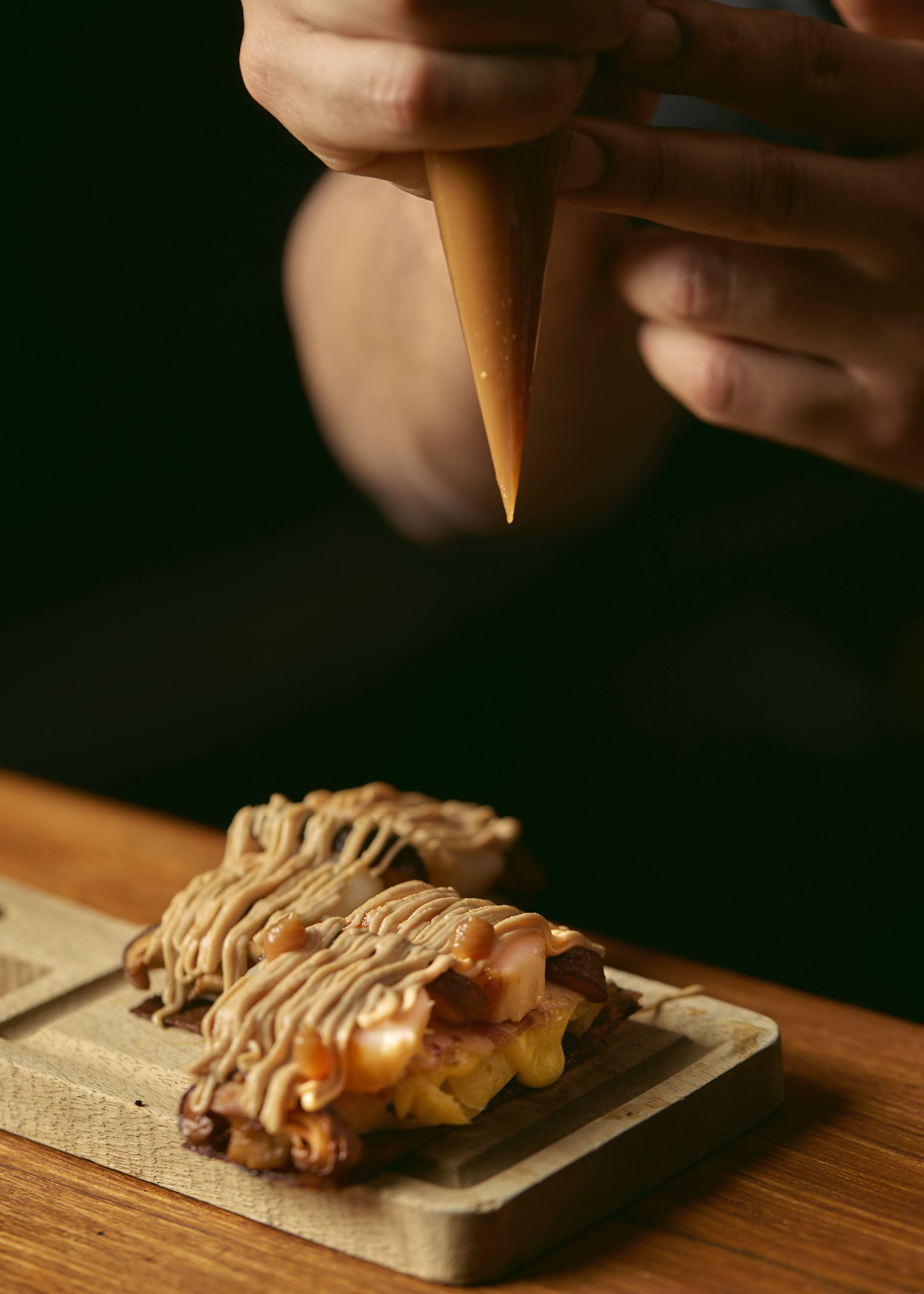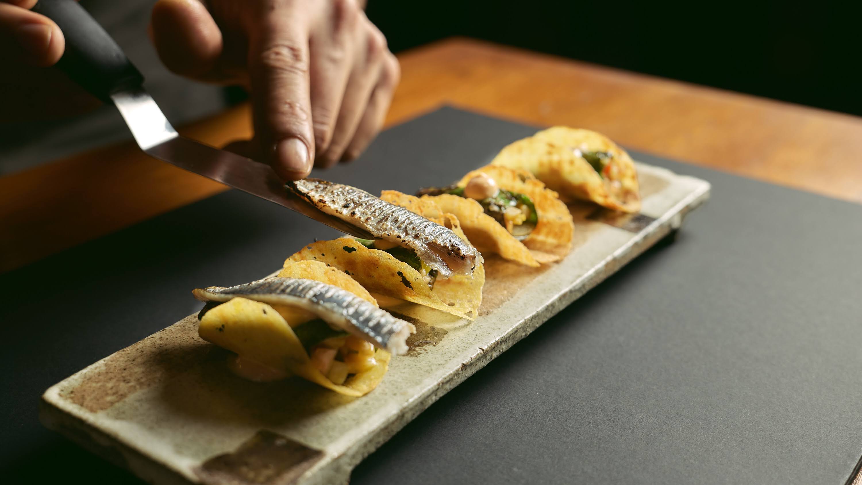 Falso taco de patata criolla, Pimiento del padrón al wok, relleno de encurtidos picantes, sardina a la llama y una emulsión de huevo frito y chile chipotle.